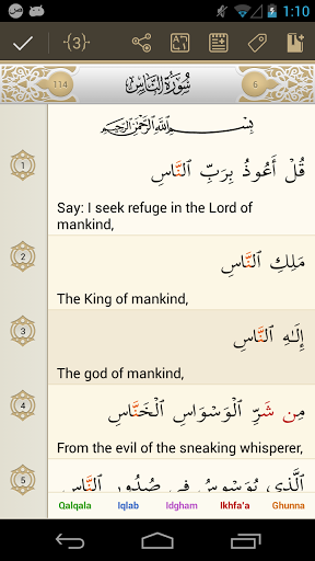 * Several downloadable recitations for verse by verse recital (supports gapless/continuous recitation for all reciters except Husary)