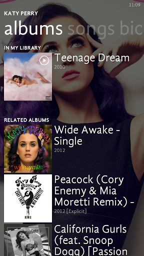 •Browse the albums sections not in your library and even get the album prices, 30 seconds audio samples of tracks, and “Buy” links to the albums.