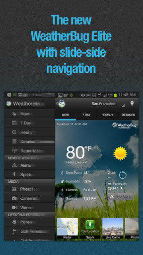 NEW! This is our best WeatherBug yet with slick new slide-side navigation, live customizable tiles and a boatload of extra content such as Spark lightning alerts and selectable background themes. Now with even easier access to exclusive real-time weather data, forecasts and alerts from the only neighborhood-level weather and alerting sensor network (ours!).